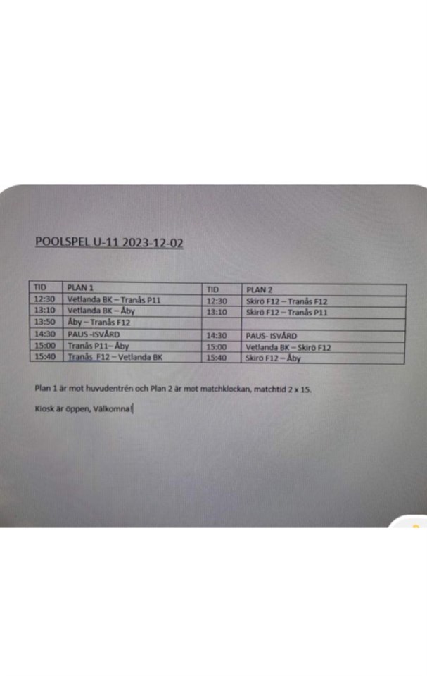 Hej, Info om vad som gäller i helgen: Ingen träning lördag. Poolspel lördag, samling 11.15. Spelschema se bifogaf bild. Match söndag, avresa 08:30 från Hydro Arena. Ta med mat till på vägen upp/innan match. Ta med något att äta till efter matchen. Hämta F17 i Vänersborg. Blir ett stopp på vägen hem för att köpa mat. Hemma ca 21 vid Hydro. Vill några föräldrar/syskon följa med går det bra. Kostnad 150:-.