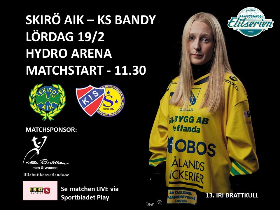 Dags för säsongens näst sista seriematch för damlaget. KS Bandy gästar Hydro Arena i morgon, lördag, vid ett udda klockslag, 11.30. -Vår match och VBK-Tellus lades både 15.00. Eftersom det är sista serieomgången i herrarnas elitserie måste alla matcher spelas samtidigt. Då fick vi flytta vår tid, först till efter VBK-matchen men nu är den förlagd före, säger Skirös tränare Leif Hedberg. Skirös möten med KS har tenderat att bli matcher av derbykaraktär. -Tydligen något som uppstått sedan ett antal år tillbaka. Ålderskonstruktionen är ju mycket lika varandra så tjejerna har stött på varandra många gånger i olika former, seriespel och cuper. Och flera av våra tjejer har spelat i yngre landslag tillsammans med KS-tjejerna så de känner varandra ganska bra, säger Hedberg. Jämfört med laget som mötte Skutskär så är Kicki Sigfridsson tillbaka i Skirö. -Det är alltid tuffa och täta matcher mellan oss och KS Bandy. Det skiljer alltid bara något eller några mål och det blir nog samma visa den här gången, säger Hedberg. KS har fortfarande möjligheter att gå till slutspel. Men då är nog seger mot Skirö ett måste. Skirö kan i sin tur definitivt säkra en slutspelsplats. Vid seger mot KS är detta ett faktum. Därav satsar man ordentligt på förberedelser och samlas redan tre timmar före match. -Matchen spelas ju som nämnts relativt tidigt på dagen och vi vill gärna inte att någon spelare i princip ska gå direkt från sängen till samlingen, avslutar Hedberg