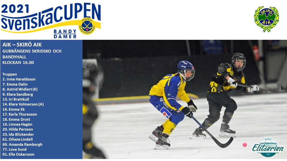 Klockan 16.00 spelar Skirö Dam mot AIK i Gubbängens skridsko- och bandybana. Sista gruppspelsmatchen i Svenska Cupen.